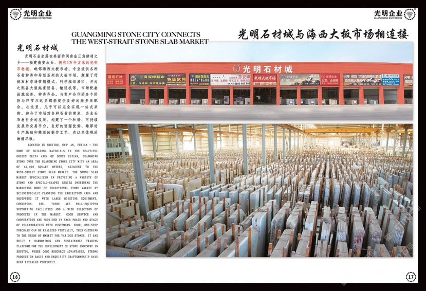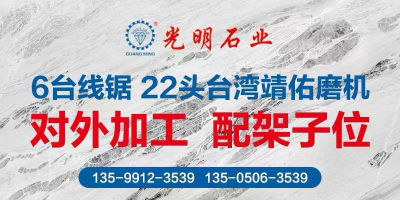 光明石業(yè)創(chuàng)建于1991年,歷經二十多年發(fā)展投資,現已成為集金剛石刀具、礦山開采、多品類石材生產加工、大型工程承接、石材產業(yè)鏈生態(tài)平臺為一體的多元化、跨地域大型石材集團,總注冊資金近2億元,占地幾十萬平方,員工上千人,是中國石材行業(yè)經營規(guī)模、加工水平、綜合實力強的企業(yè)之一。旗下擁有多家子公司,包括南通新光明石業(yè)發(fā)展有限公司、錦明石業(yè)有限公司、新疆光明礦業(yè)、光明石材城。\\\\\\\\\\\\\\\