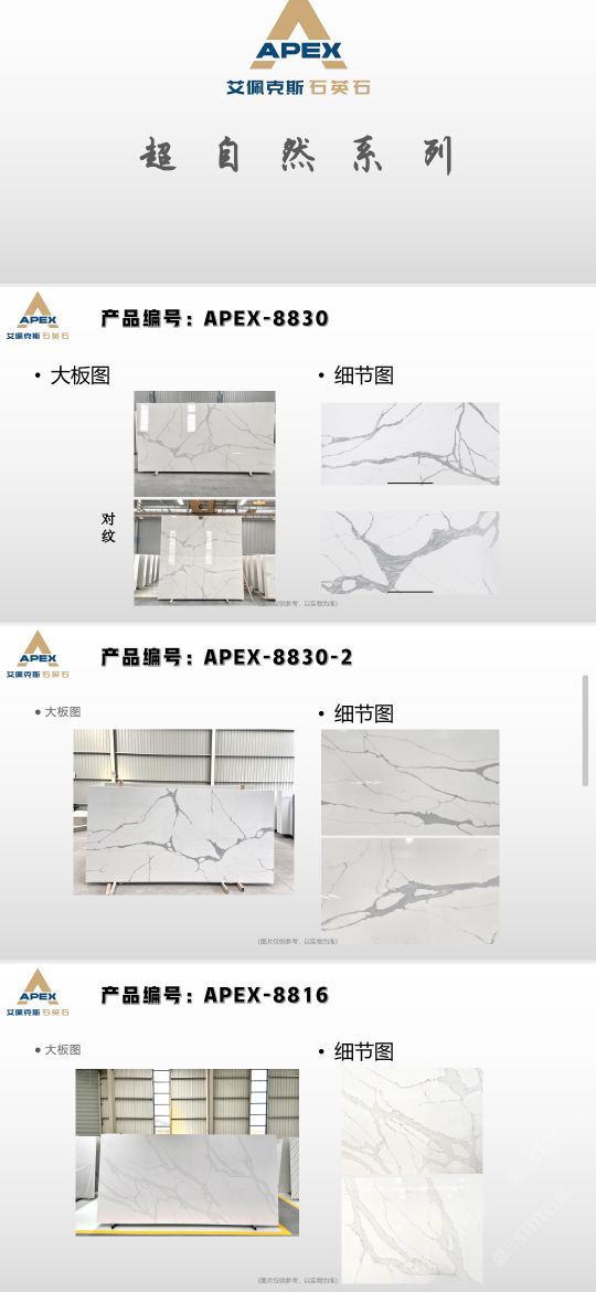 艾佩克斯秉承“精益求精”的開(kāi)發(fā)理念,在人造石生產(chǎn)工藝上大膽突破,研發(fā)出更具特色的新石代石英石,色彩自然豐富,具有天然石材的質(zhì)感和美麗的表面光澤。產(chǎn)品具有刮不花、不污染、用不舊、燃不著、無(wú)輻射等五大特點(diǎn),可以廣泛用于公共建筑酒店、餐廳、銀行、醫(yī)院、展覽館、實(shí)驗(yàn)室等和家庭裝修廚房臺(tái)面、洗臉臺(tái)、廚衛(wèi)墻面、餐桌、茶幾、窗臺(tái)、門(mén)套等領(lǐng)域,是一種無(wú)放射污染、可重復(fù)利用環(huán)保、綠色新型建筑室內(nèi)裝飾材料。是的裝飾裝修材料。