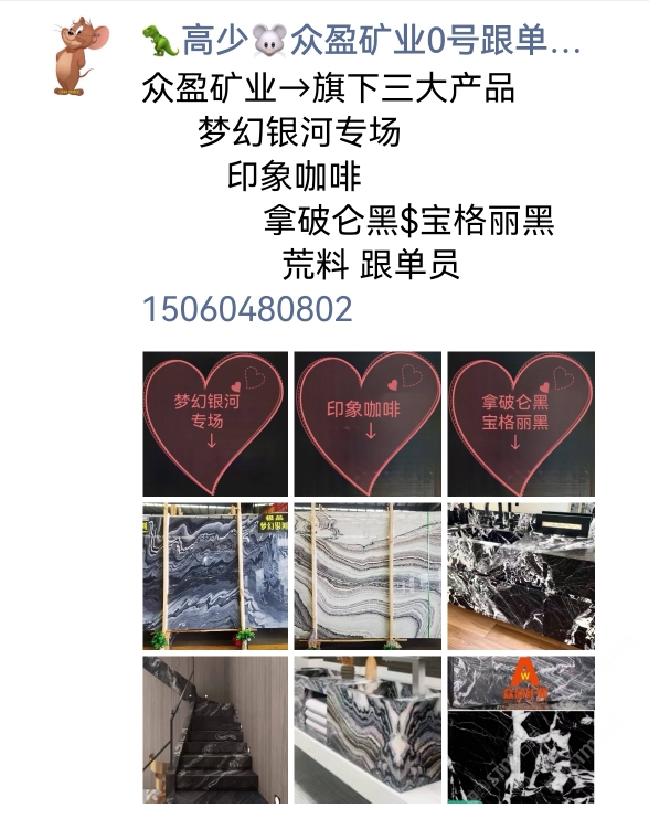 眾盈礦業(yè)主營(yíng):夢(mèng)幻銀河專場(chǎng),、新品意大利黑白(寶格麗黑/拿破侖黑)、新品→印象咖啡(紫山水),潘多拉,宇宙灰(鮑魚(yú)石)