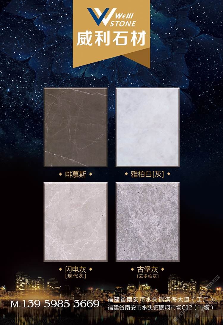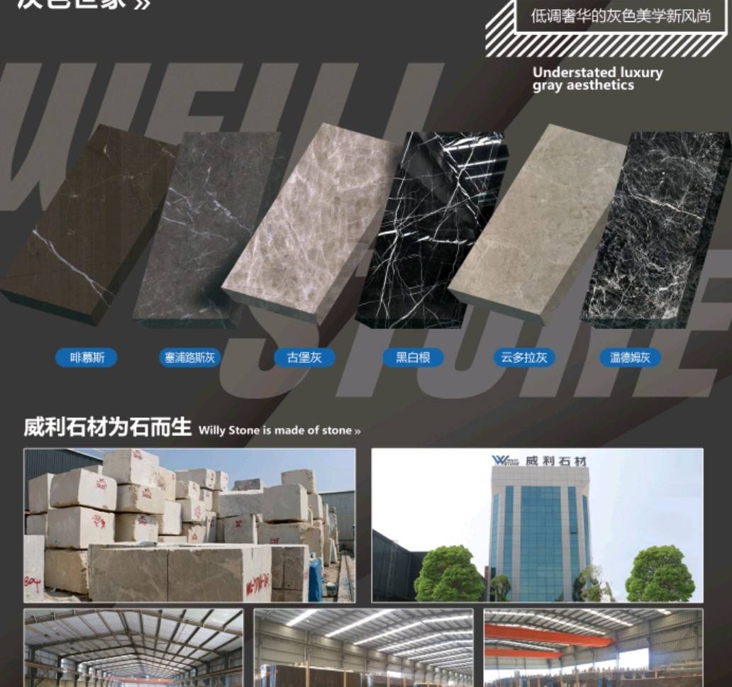 南安市威利石材有限公司成立于2008年,是一家集礦山開采、加工、銷售、工程設(shè)計(jì)施工、進(jìn)出口貿(mào)易為一體的綜合型企業(yè)。我們不僅提供石材,更為您精心設(shè)計(jì)全套優(yōu)質(zhì)的石材解決方案。 威利石材專注于石材產(chǎn)品的礦山荒料直銷、大板加工、大板展銷、工程設(shè)計(jì)、工程配套施工服務(wù) 。公司主營(yíng)啡慕斯、黑白根、塞浦路斯灰、古堡灰,愛馬仕灰(溫德姆灰),雅柏白,閃電灰多種優(yōu) 質(zhì)品種。公司已成為一家集專業(yè)化、產(chǎn)業(yè)化和規(guī)?;墓こ滩牧喜少?gòu)、加工配套服務(wù)商。 威利石材以自己多年專業(yè)化和國(guó)際化的經(jīng)營(yíng),與國(guó)內(nèi)外礦山建立了良好的商業(yè)信譽(yù)和經(jīng)貿(mào)合作關(guān) 系,贏得了國(guó)外礦山在中國(guó)區(qū)營(yíng)銷戰(zhàn)略的全力支持。 威利石材依靠豐富的礦山資源,先進(jìn)的管理、施工經(jīng)驗(yàn),堅(jiān)持“以市場(chǎng)為導(dǎo)向、以技術(shù)為主體、 以質(zhì)量為命脈、以效益為中心”,大膽探索,在技術(shù)進(jìn)步、生產(chǎn)經(jīng)營(yíng)、企業(yè)管理、產(chǎn)品質(zhì)量、售后服務(wù)等 方面始終走在行業(yè)的前列。并在信守“質(zhì)量為準(zhǔn)、信譽(yù)優(yōu)等、服務(wù)為上”的企業(yè)精神指導(dǎo)下,產(chǎn)品暢銷世 界各地,深得消費(fèi)者的信賴和贊譽(yù)。我們時(shí)刻把握時(shí)代脈搏,走在市場(chǎng)前沿,揮灑石材文化,增添人類輝煌。多年來(lái)我們一直致力于服務(wù)質(zhì)量的提高?!邦櫩蜑樯稀?、“追求圓滿”已經(jīng)融入到公司的企業(yè)文化、經(jīng)營(yíng) 理念當(dāng)中,并且在產(chǎn)品生產(chǎn)、過(guò)程服務(wù)、售后追蹤等具體工作中得到落實(shí)。 我們的追求——集世界美石,為中國(guó)添彩!\