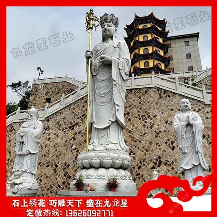 發(fā)布信息: 石雕地藏王座像 地藏王菩薩石刻像 廠家定制——九龍星石業(yè)。 石雕地藏王座像以一頭形似獅子的怪獸為坐騎的,名號(hào)曰:“諦聽(tīng)”。諦聽(tīng)又稱“獨(dú)角獸”,“地聽(tīng)”,“善聽(tīng)”,乃九華山鎮(zhèn)山之寶,相傳為金地藏菩薩坐騎。地藏王菩薩石刻像一般都是以光頭或者戴個(gè)五佛冠,也就是法師常戴的帽子。地藏王菩薩還有一個(gè)大的特點(diǎn)就是右手會(huì)有一根禪杖;左手當(dāng)胸棒有一顆寶珠。 石雕地藏王座像或稱地藏王菩薩,曾音譯為“乞叉底蘗沙”。因其“安忍不動(dòng)如大地,靜慮深密如秘藏”,故名地藏。為佛教四大菩薩之一,與觀音、文殊、普賢一起,深受世人敬仰。以其“久遠(yuǎn)劫來(lái)屢發(fā)弘愿”,故被尊稱為大愿地藏王菩薩。