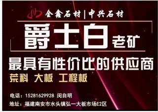 君陽·上景石業(yè)主營產(chǎn)品:雅士白,雅士白1,雅士白(希臘礦),雅士白(新礦),雅士白(希臘),爵士白,爵士白2,爵士白(老礦),爵士白(大礦),新爵士白企業(yè)地址:福建泉州南安市萬典石材城1號門走到底(君陽-上景石業(yè))