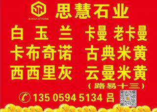 思慧石業(yè)主營產(chǎn)品:白玉蘭,白玉蘭3,白玉蘭(8號(hào)礦),白玉蘭(艾斯特),白玉蘭(白珍珠),白玉蘭ECE,白玉蘭(EG礦),白玉蘭(飛馬礦),白玉蘭2,白玉蘭1,白玉蘭4,西西里灰,西西里灰1,西西里灰2,古典米黃,古典米黃1,卡布奇諾,云曼米黃,云曼,卡曼,卡曼米黃,金卡曼,路易十三,路易十三1(CGM),勞力士灰,奧特曼,歐曼米黃,奧特曼(巴拉礦),奧特曼(捷成礦),奧特曼(卡麻桑礦),奧特曼(老蕭礦),奧特曼(卡瑪薩礦),奧特曼米黃,奧特曼金,白玉蘭(胖子礦),白玫瑰企業(yè)地址:福建泉州東升石材城4號(hào)門通道走到底左手邊D26